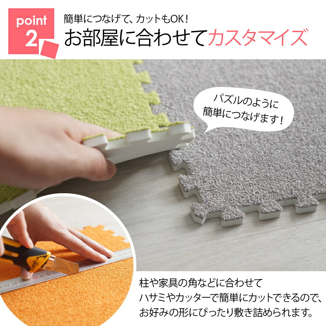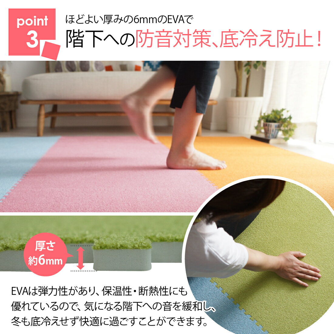 商品詳細 商品詳細(スペック) 機能 手洗いOK/ホットカーペット・床暖房/防音 商品スペック 素材:ポリエステル 中材:6mmEVA(白色) パイル長:約2mm 耐熱:60℃まで可 梱包:ダンボール箱 生産国:中国 商品について(ポイント) 色・形、組み合わせ自由自在、パズルのように簡単に繋げられる♪
